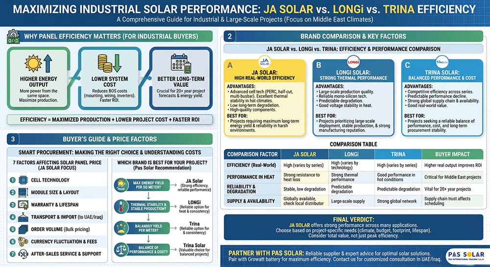 Understanding why panel efficiency matters, especially in industrial-scale and large projects, is so important when evaluating the efficiency of JA Solar panels and comparing them with LONGi or Trina. For large-scale solar systems, commercial factories, or high-consumption industrial areas, panel efficiency goes beyond a mere technical metric, making it a crucial advantage. For engineers, distribution managers, and solar contractors around the Middle East, like Iraq & the UAE, more efficient panels deliver higher power output for the same space, cut down installation and system costs, and improve long term return on investment. When buying in bulk, even a small difference in efficiency can affect the whole project’s production over time.