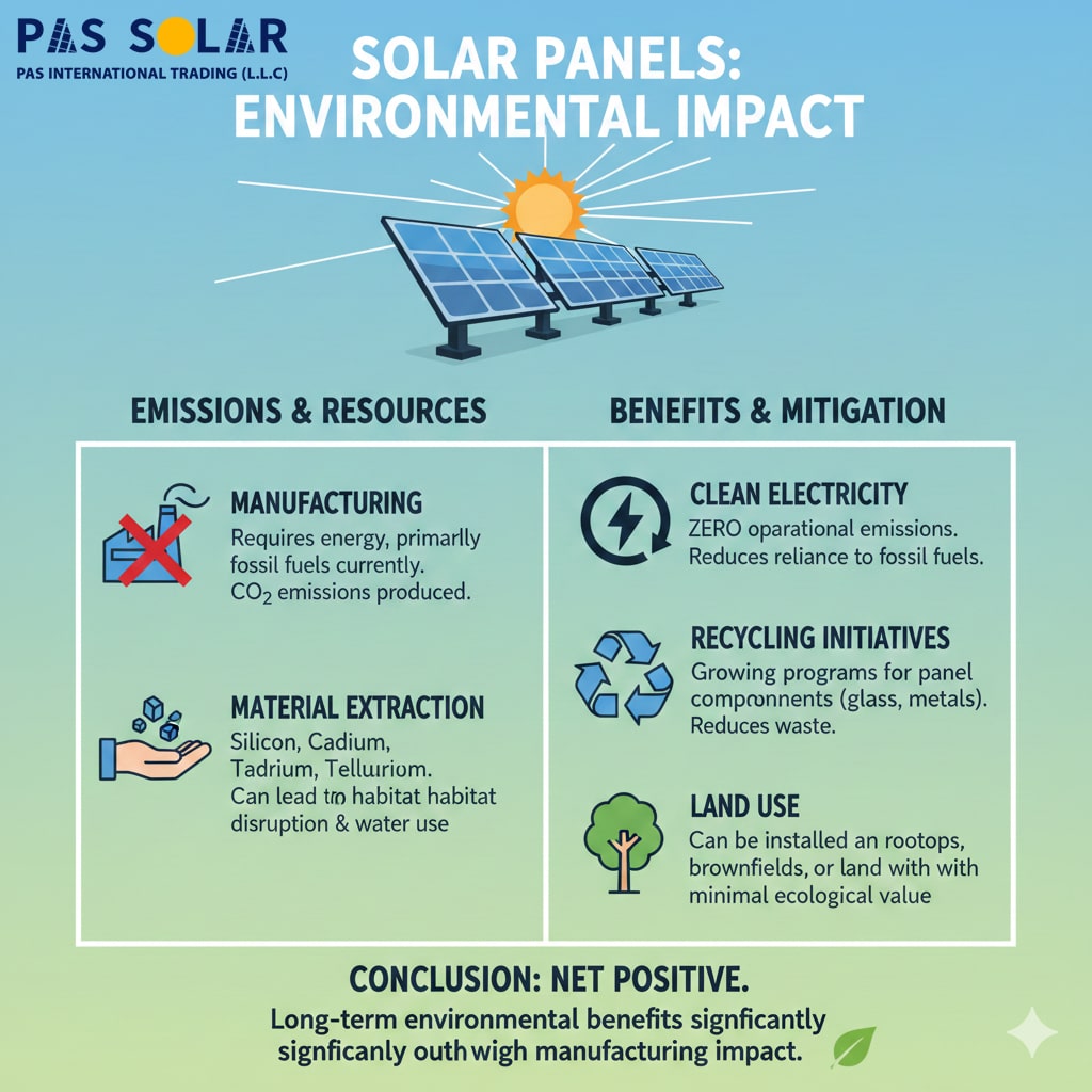 | Air & Climate | Zero emissions during operation, reduces greenhouse gases | Emissions during manufacturing | Shows the true carbon footprint of solar panels |